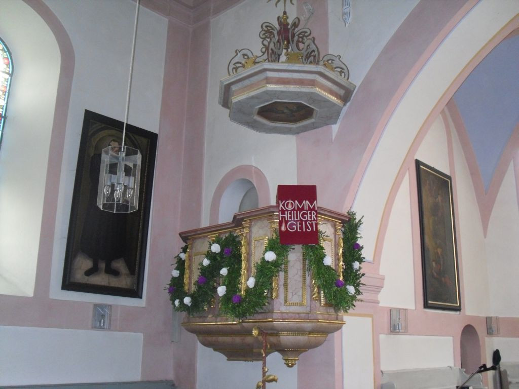 Die Kanzel weist einen vieleckigen Korb auf; sein profilierter Unterbau endet in einer stilisierten Sonnenblume. Die vergoldeten Lorbeergirlanden sind kennzeichnend für den barocken Stil und begegnen uns auch an den westlichen Emporen. Auf der Unterseite des achteckigen Schalldeckels ist eine Taube abgebildet, die den Heiligen Geist symbolisiert. In der strahlenförmigen Sonne an der Spitze der Kanzelbekrönung sind die hebräischen Buchstaben des Gottesnamens zu erkennen. Dieser mit vier Konsonanten ausgestattete Name "Jahwe" (zu Deutsch: "Der ins Dasein Rufende") wird "Tetragramm" genannt.